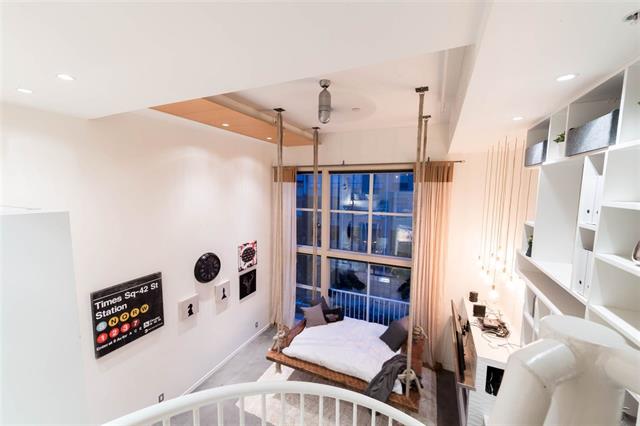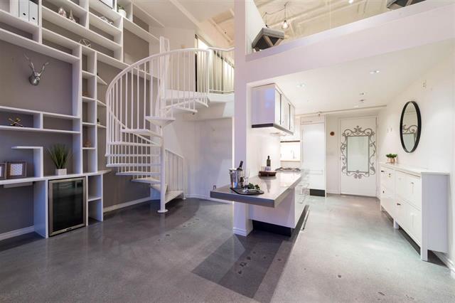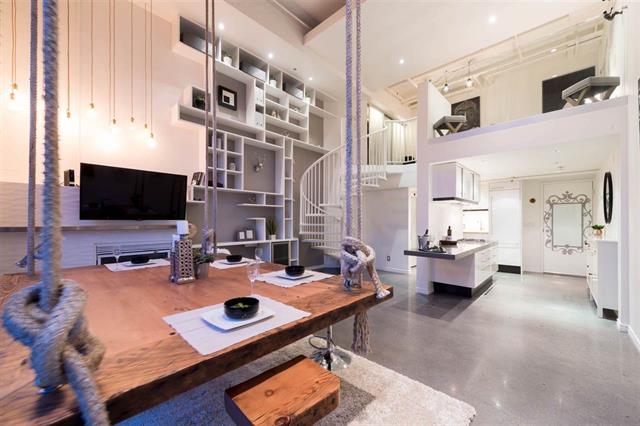Floor to ceiling windows, polished concrete floors, city and mountain views, extended patio and lots of storage, what more could you ask for in a custom 2 level loft in Mount Pleasant!? Varies upgrades include shelves which stretch from the floor to ceiling; a gas fireplace with Parisian ceramic tile and stainless steel mantle accented by a pendant light installation; crown mouldings; and a reclaimed fir day bed that transitions into a dining table, suspended from the ceiling by industrial tug lines.